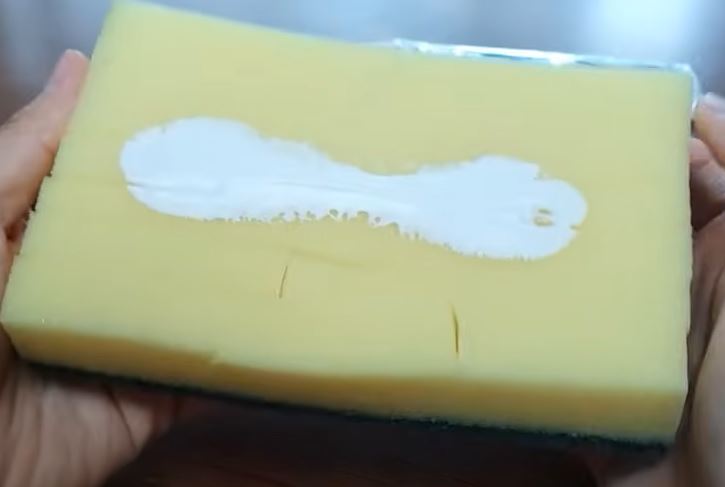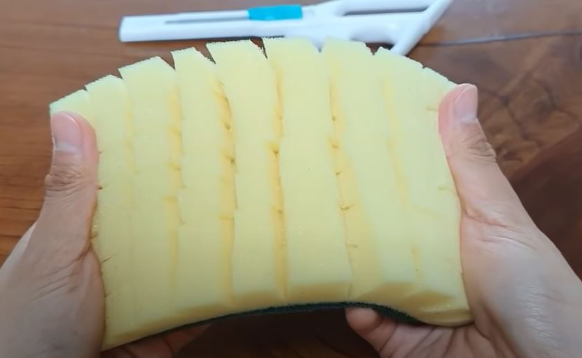 ✔아래와 같이 생긴 스펀지를 준비해 줍니다. 이때 스펀지 수세미의 거친 부분이 잘리지 않도록 주의하면서 스펀지를 가로, 세로 모양이 나도록 벌집 모양으로 잘라줍니다.