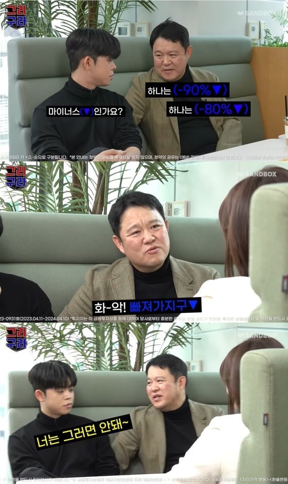 김구라는 "다른 증권사에 금액을 맡겨놨는데 그분이 추천해 주신 미국 주식이 하나는 수익률이 마이너스 90%고, 하나는 마이너스 80%다. 마이너스 90%는 좀 너무 심한 거 아니냐"고 토로했다.