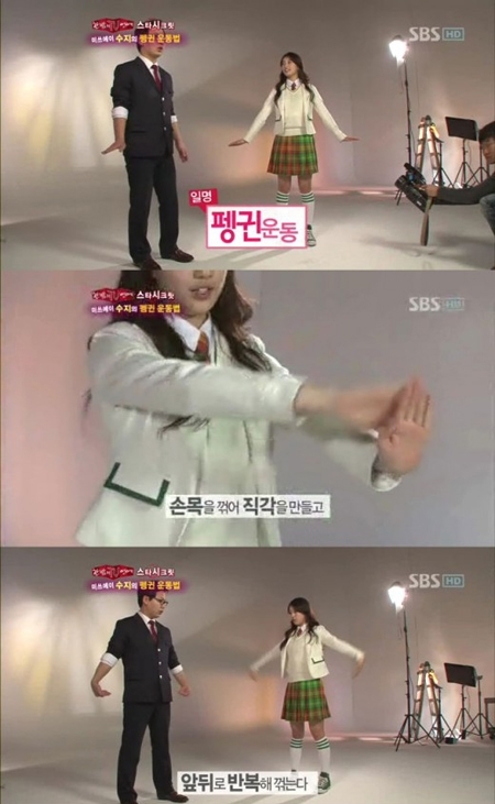 수지는 “사람들이 보기에는 ‘뭐 하는 거지?’라고 생각할 수 있는데 알고 보면 이게 운동이 된다”며 “두 팔을 펭귄 자세처럼 모아 경쾌하게 튕겨야 한다”라고 말했다. “손목을 꺾어 직각을 만들고 앞뒤로 8회씩 반복하는 동작으로 총 20번 반복해 준다”며 “이 운동을 하면 팔뚝과 손목이 얇아지는 것을 느끼게 된다”라고 한다.
