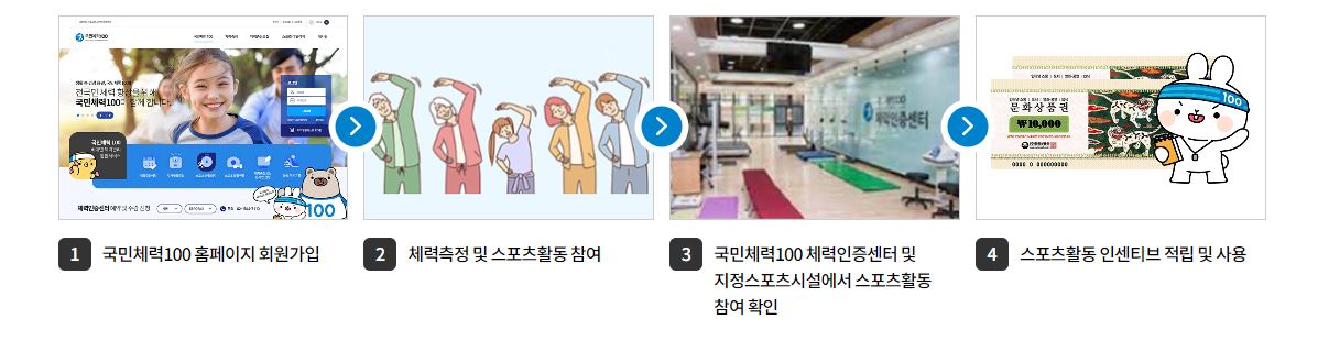 국민체력 100의 다양한 체력관리 서비스와 스포츠활동에 참여 후 적립 기준에 따라 인센티브를 지급하고 리워드 상품으로 교환할 수 있는 대국민 체력증진 서비스입니다. (리워드 상품 : 문화상품권)