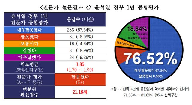 종합평가 점수는 21.16점으로 잘못했다는 응답은 76.52%(매우 잘못함 67.54%, 잘못함 8.99%)인 반면 잘했다는 18.84%(매우 잘함 9.86%, 잘함 8.99%)에 그쳤다. 이전 역대 정부 출범 1년 전문가 평가에서 문재인 정권은 종합평가에서 73.08점을 받아 윤석열 정부보다 세 배 이상 높았다.