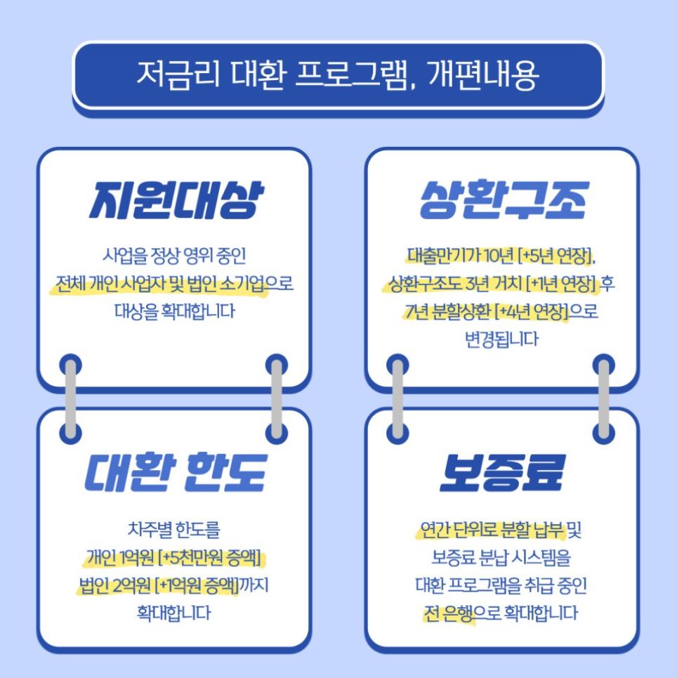 대환 프로그램을 신청하신 분들도 한도가 늘어났기 때문에 추가로 신청하실 수 있습니다. 자영업 하시는 분들은 본인의 대출이자 한 번씩 확인해 보시고 금리가 높은 경우에는 꼭 신청하시면 좋겠습니다.
