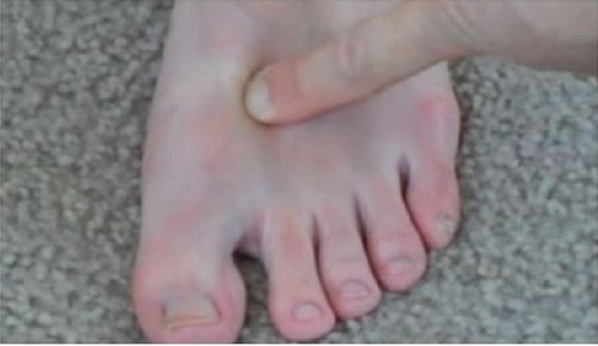 3. 올린 발의 내측 아치 쪽(발바닥 중간의 안쪽)을 손으로 꾹 누르면서 만져보면 딱딱한 끈 같은 덩어리가 만져진다.