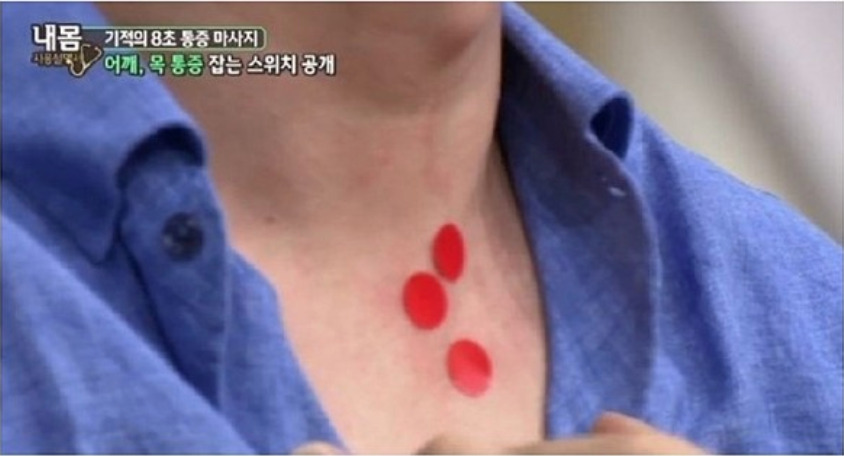 쇄골이 시작되는 곳 정중앙과 그 위아래를 지압해주면 어깨와 목의 통증을 잡아줄 수 있습니다. 만약 오른쪽 어깨가 아프다면 오른쪽 쇄골을. 왼쪽 어깨가 아프다면 왼쪽 쇄골을 만지시기 바랍니다.