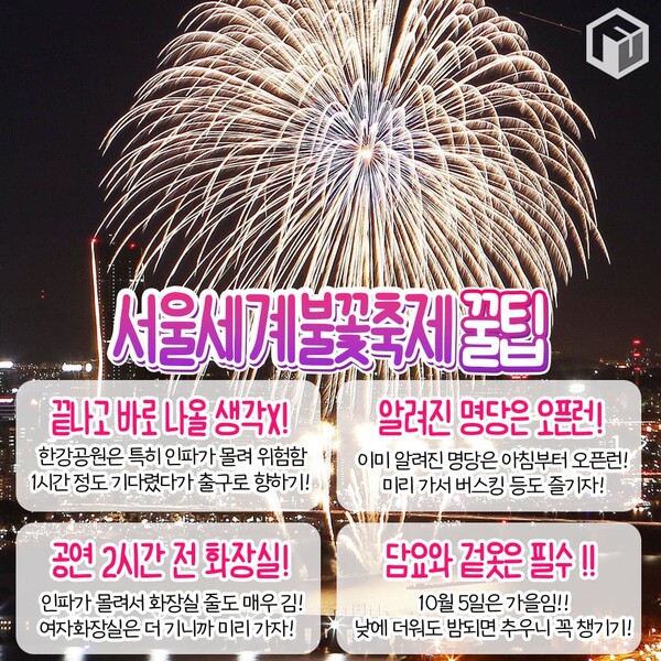 - 화장실 이용: 인파가 많기 때문에 화장실 줄이 매우 길어질 수 있습니다. 불꽃쇼가 시작되기 2시간 전에는 미리 다녀오는 것이 좋습니다.